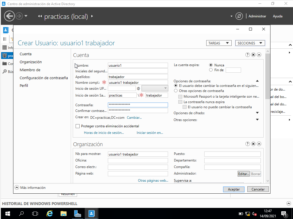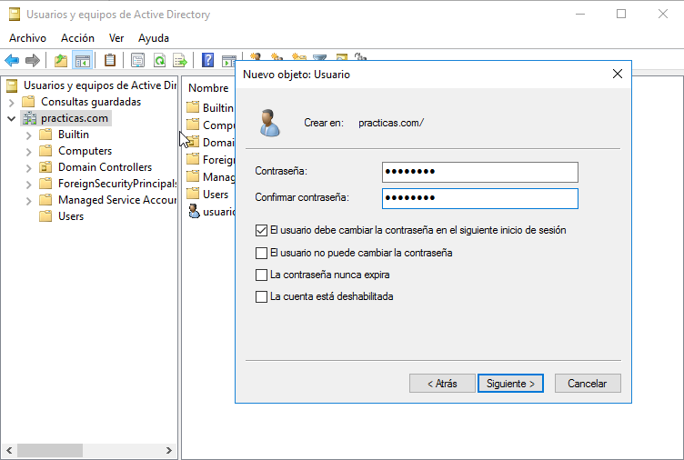 Cuando se nos abra la ventana para crearnos el usuarios e introduzcamos los datos, tendremos que ponerle una contraseña (la contraseña que se pone incialmente suele ser una contraseña temporal) aunque tendremos varias opciones de configuracion de la cuenta: