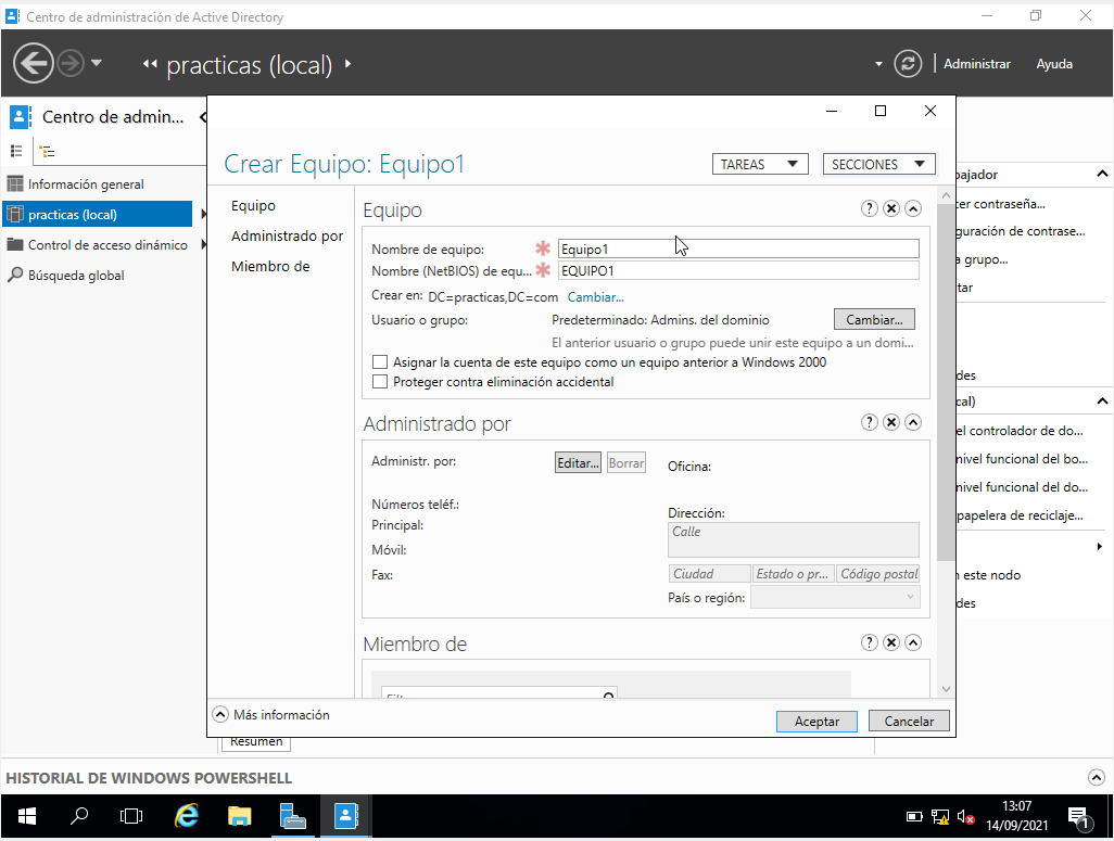 El mismo procedimiento realizamos para la creación de cualquier otro objeto en nuestro Directorio Activo, equipos, OUs, etc. Por ejemplo para la creación de un equipo nos dirigimos al menú inferior derecho del Centro de administración de Active Directory y elegimos Nuevo / Equipo.