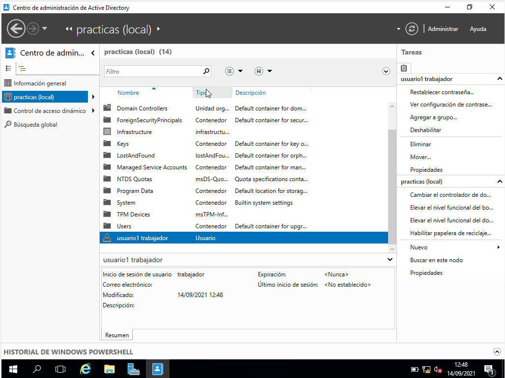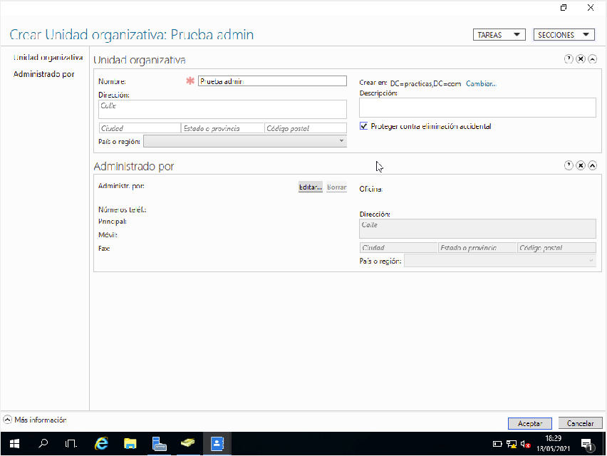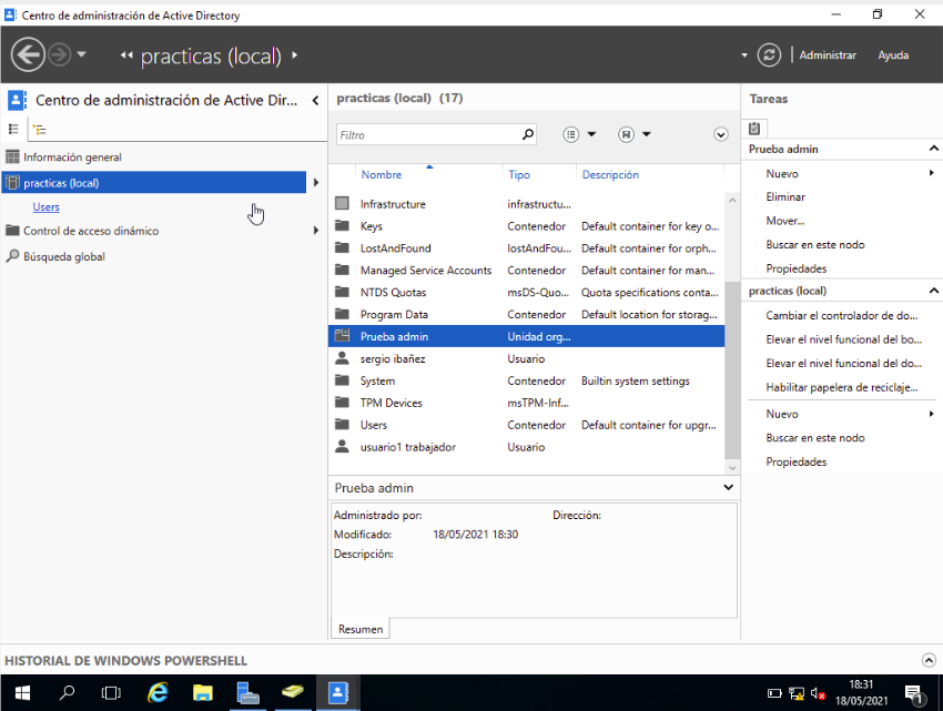 - Podremos ver que nuestra OU Pruebas ha sido creada correctamente dentro de nuestro árbol: