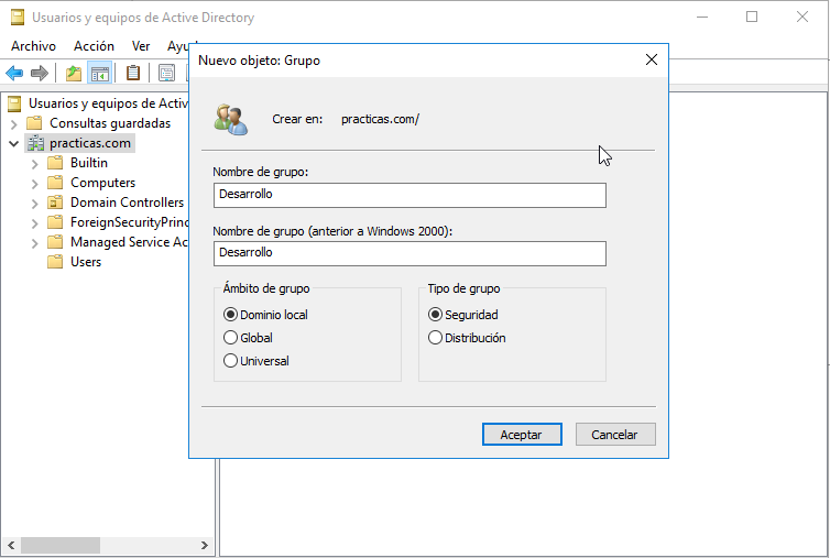Hacemos clic en la raíz de nuestro dominio, en mi caso el dominio Practicas y haciendo clic derecho elegimos la opción “nuevo” y despues la opción “grupo”. Una vez que se nos abra la ventana para crear el grupo tendremos que asignarle un nombre así como elegir el ambito y el tipo de grupo que será. Ej: