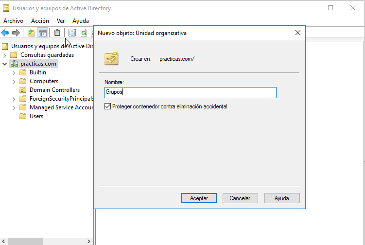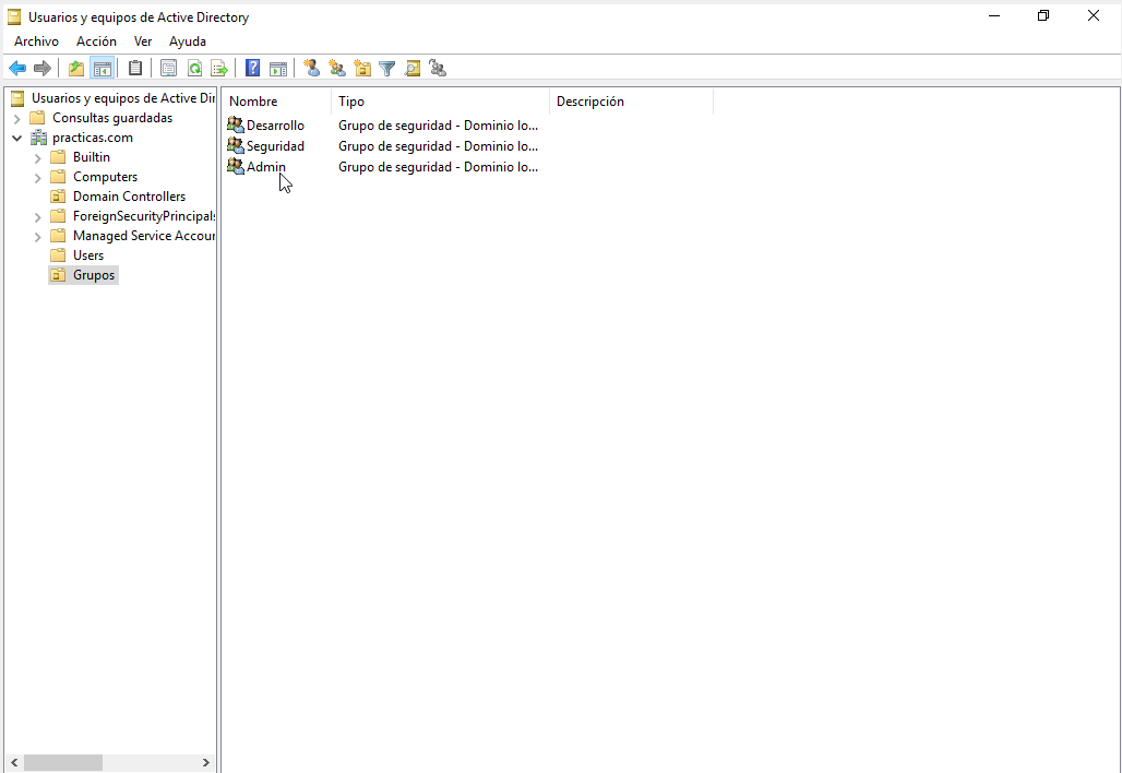 En este ejemplo para tener mejor organizados los grupos, he creado una Unidad Organizativa (OU), llamada grupo donde estan alojados varios grupos (como si fuese una empresa real):
