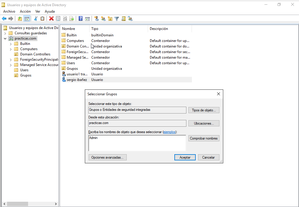 Después de agregar tendremos que indicar a que grupo se agregara el usuario, por ejemplo si mi dominio se llama Pruebas y en la empresa será uno de los administradores, seria Admin (para ello debe existir previamente el grupo que especifiquemos sino obviamente no podremos agregar ningun usuario). Ej: