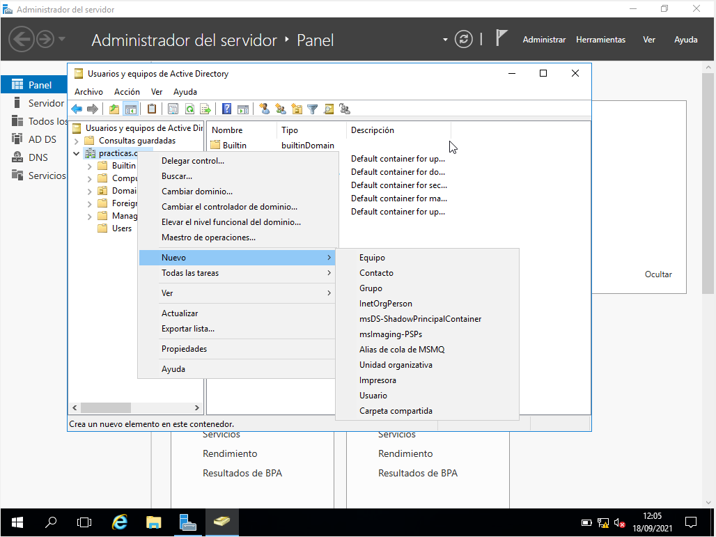 Hacemos clic en la raíz de nuestro dominio, en mi caso el dominio Practicas y haciendo clic derecho elegimos la opción “nuevo” y despues la opción “objeto”.