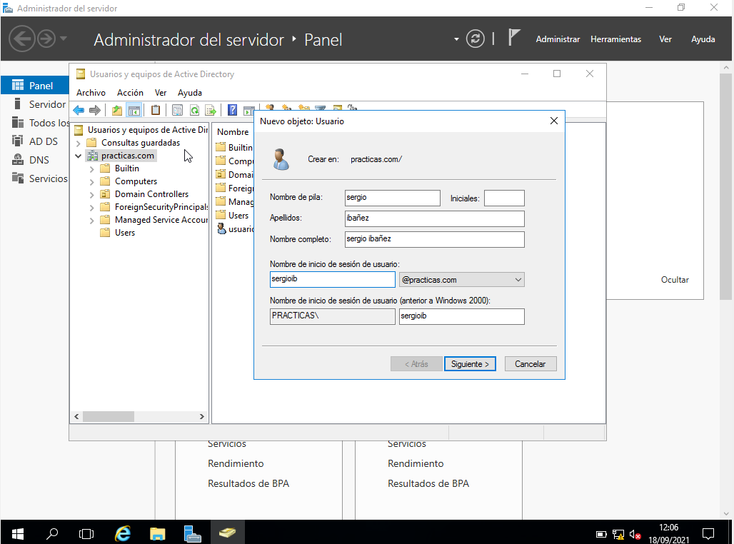 Una vez estemos en la ventana de usuarios y equipos de active directory podremos crear un usuario haciendo clic derecho en cualquier lugar de la ventana y eligiendo la opción “nuevo” y despues la opcion de “usuario”. Por ejemplo en mi caso si quiero crear un usuario dentro de mi dominio de pruebas lo que haria seria hacer clic en el nombre de mi dominio para que al crear el usuario, se crease el usuario dentro del dominio. Ej: