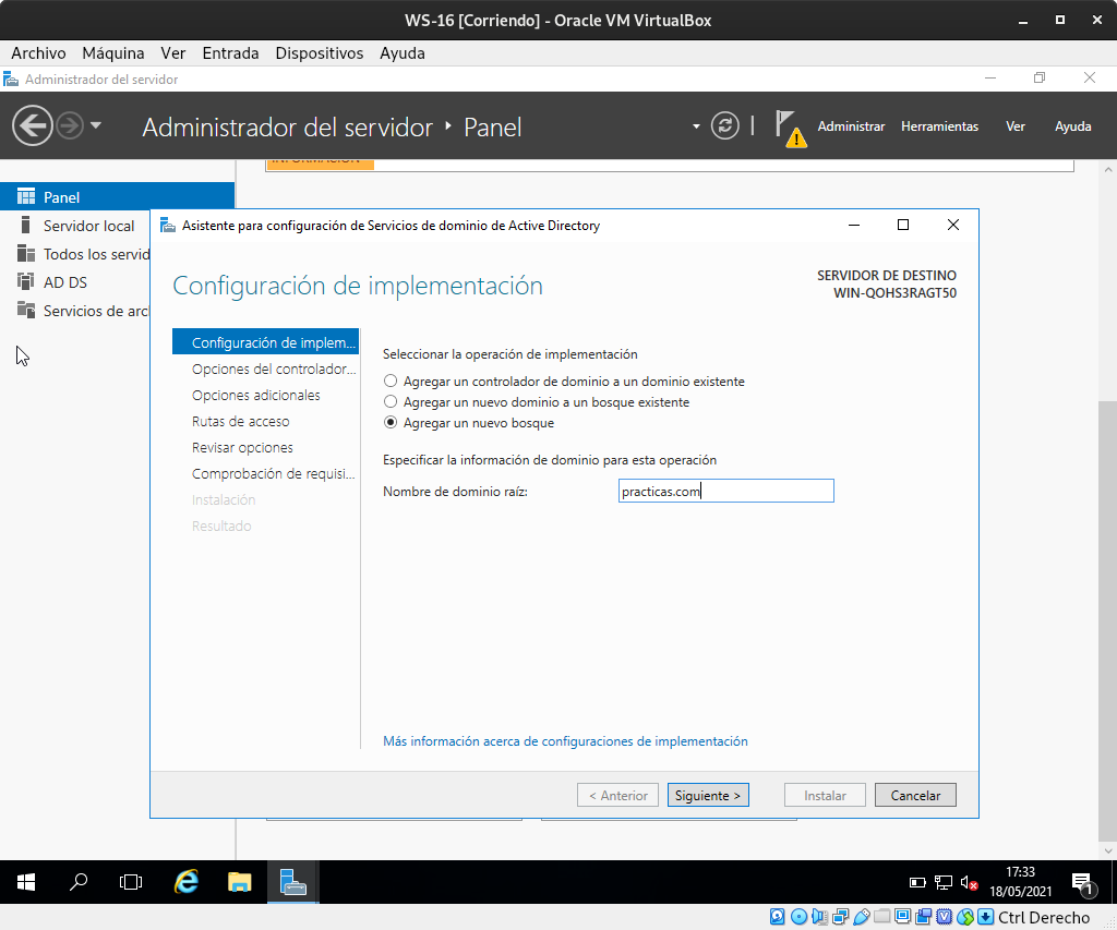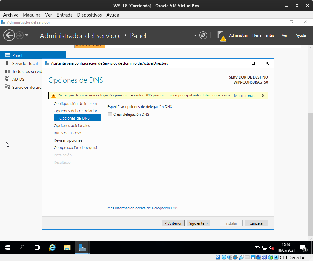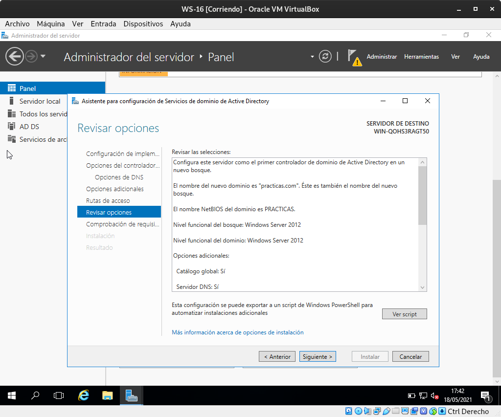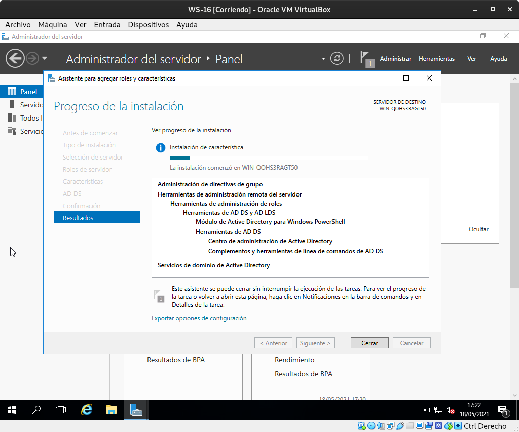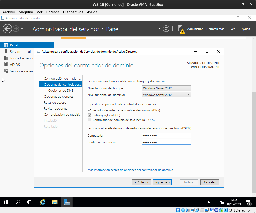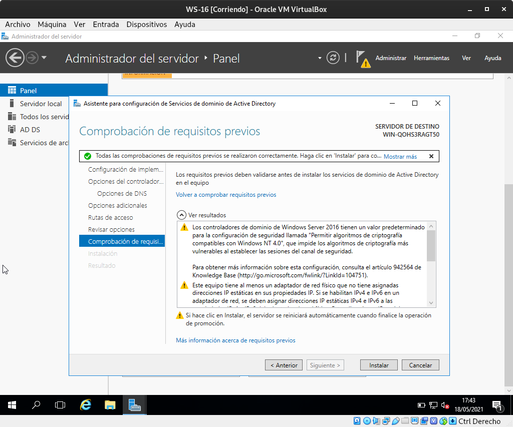 Hacemos clic en Instalar para iniciar el proceso de promover nuestro servidor a controlador de dominio.
