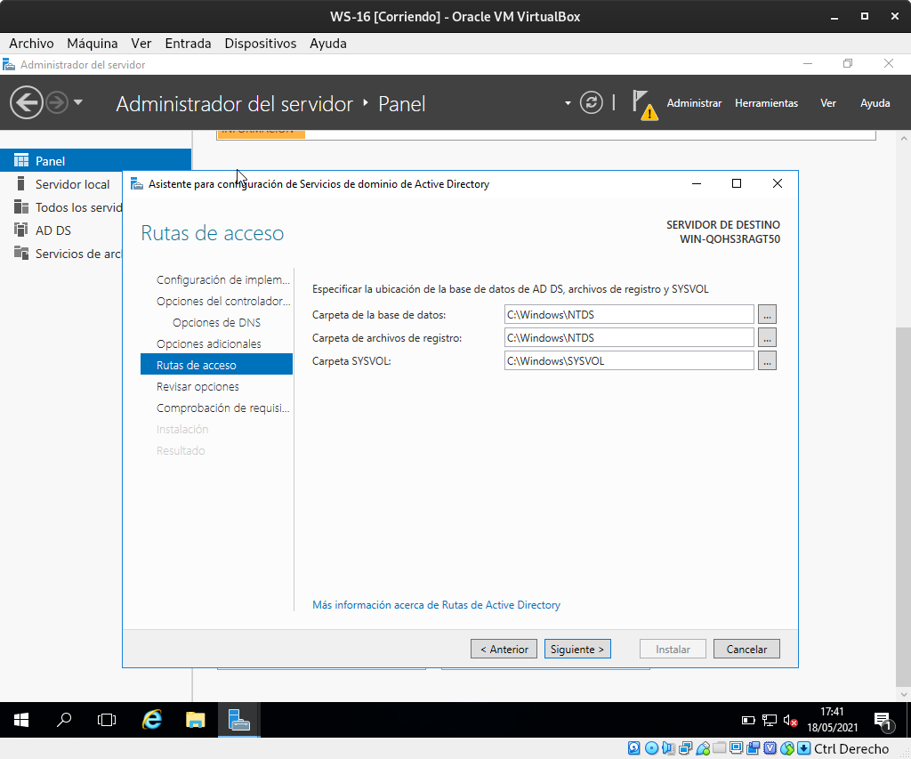 - Clic en Siguiente, se desplegará la ventana informativa de ubicación de la base de datos de AD DS.