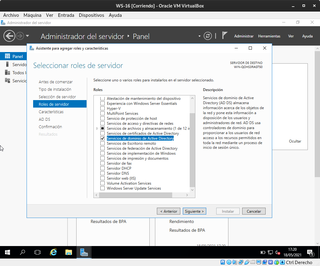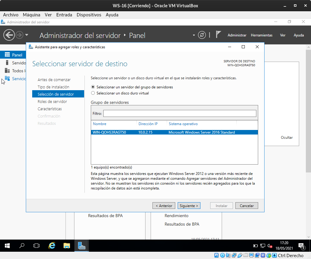 - Hacemos clic en siguiente y elegimos el servidor donde queremos instalar nuestro rol de AD DS.